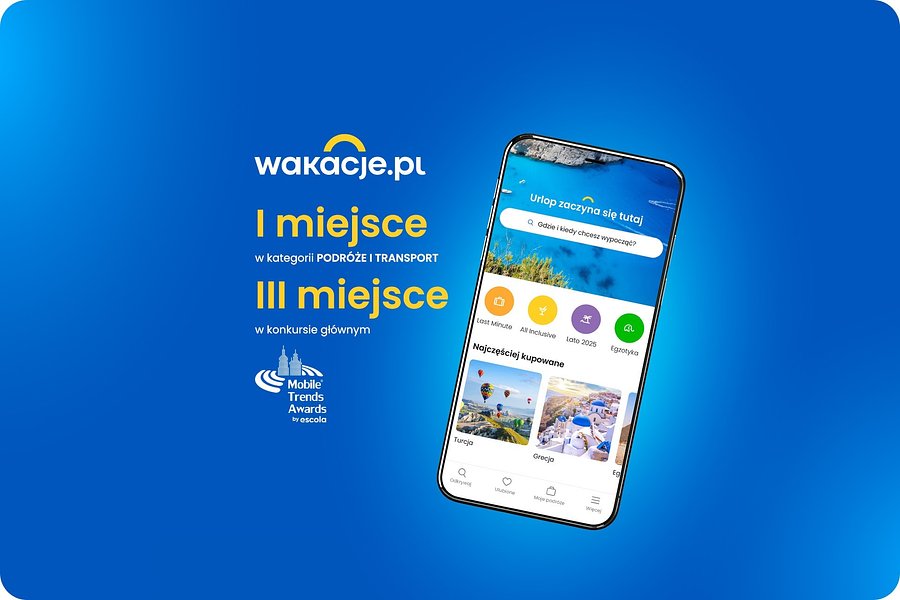 Aplikacja mobilna Wakacje.pl zwyciężyła w kategorii Podróże i Transport oraz zdobyła trzecie miejsce w konkursie głównym Mobile Trends Awards 2024, jednym z najbardziej prestiżowych technologicznych konkursów w Polsce.