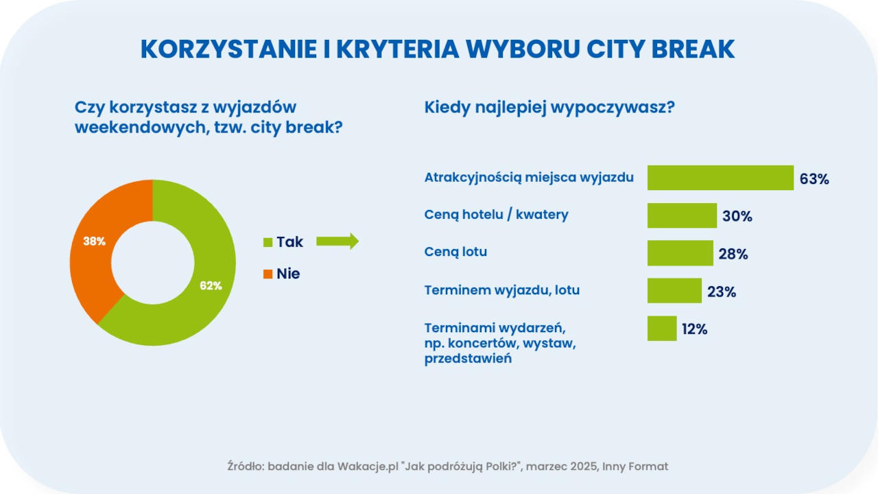 Z raportu Wakacje.pl wynika, że większość badanych kobiet organizuje sobie krótkie wypady, tzw. city breaki, a kryterium wyboru destynacji jest jej atrakcyjność, a ceny hotelu czy lotów schodzą na dalszy plan. Przy dłuższych wyjazdach na czele plasuje się cena, a atrakcje dostępne na miejscu są wskazywane jako drugie. Destynacja również znalazła się na podium, a tuż za nią hotelowy standard.