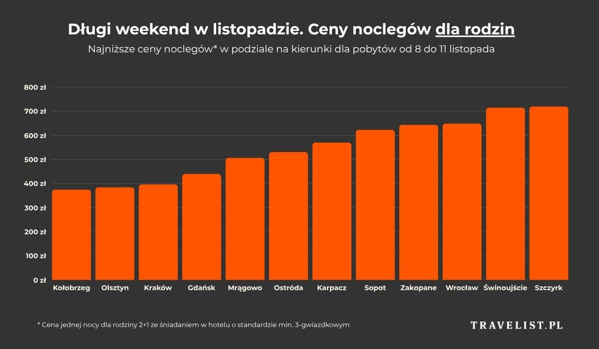Długi weekend w listopadzie to dla wielu Polaków okazja, by jeszcze przed świętami Bożego Narodzenia urozmaicić codzienną rutynę i odpocząć od pracy czy nauki. Według ekspertów portalu rezerwacyjnego Travelist.pl najtańszy pobyt dla dwóch osób ze śniadaniem można zarezerwować już od 230 zł za noc, a w przypadku rodzin z dzieckiem – od 375 zł. Zarówno pary, jak i rodziny z dziećmy najtańsze pobyty zarezerwują w Krakowie, Kołobrzegu i Olsztynie. Między 8 a 11 listopada wybieramy kierunki, które pozwalają połączyć relaks z komfortem: hotele z basenami, strefami wellness i restauracjami z regionalną kuchnią.