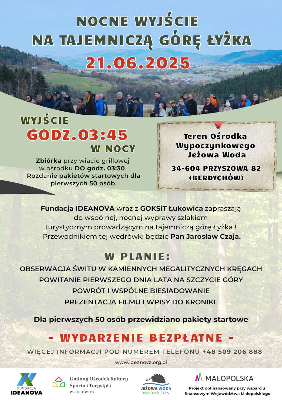 Tego samego dnia, 21 czerwca, Fundacja IDEANOVA wraz z GOKSiT Gmina Łukowica serdecznie zapraszają także na wspólną, nocną wyprawę szlakiem turystycznym na tajemniczą górę Łyżka! Przewodnikiem będzie niezastąpiony pan Jarosław Czaja. Zbiórka: wiata grillowa w ośrodku Jeżowa Woda Ośrodek Wypoczynkowy Palmiarnia i SPA – do godz. 03:30