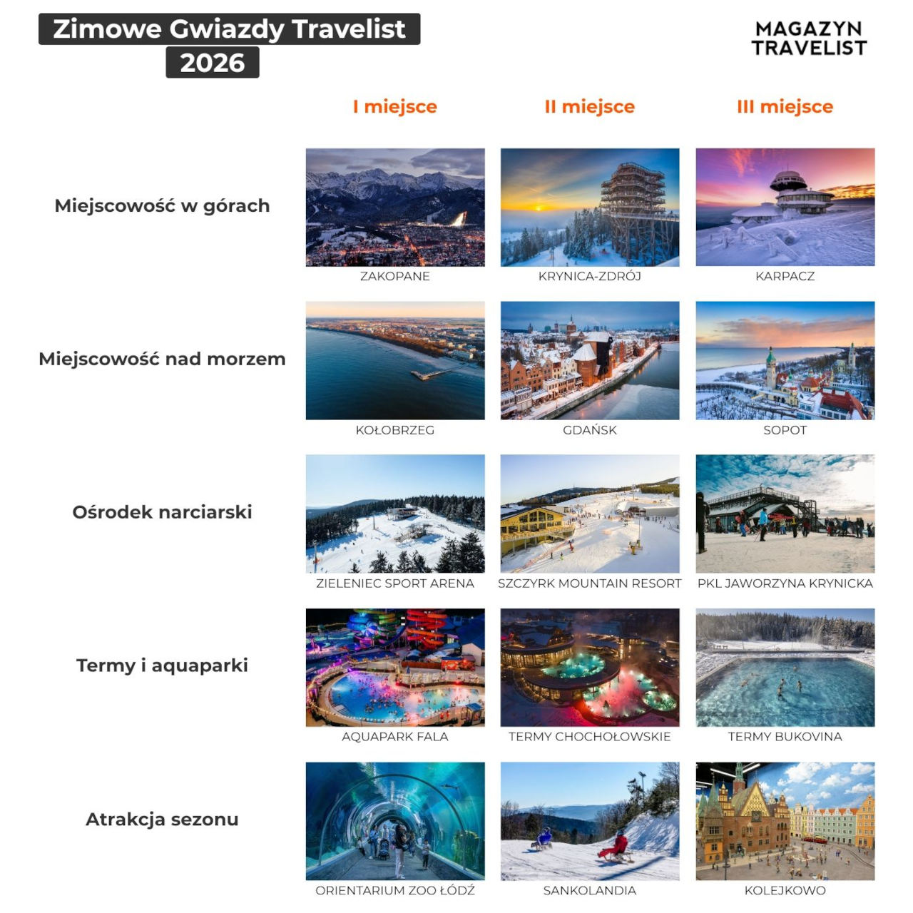 Zakończyło się głosowanie w trzeciej edycji popularnego zimowego plebiscytu organizowanego przez Magazyn Travelist. Tysiące internautów z całej Polski wskazało miejscowości, atrakcje i obiekty najlepsze na zimowy wypoczynek – od kierunków górskich i stoków narciarskich, przez termy i aquaparki, po znane atrakcje oraz miasta nad Bałtykiem. Oto wyniki rankingu „Zimowe Gwiazdy Travelist 2026”.
