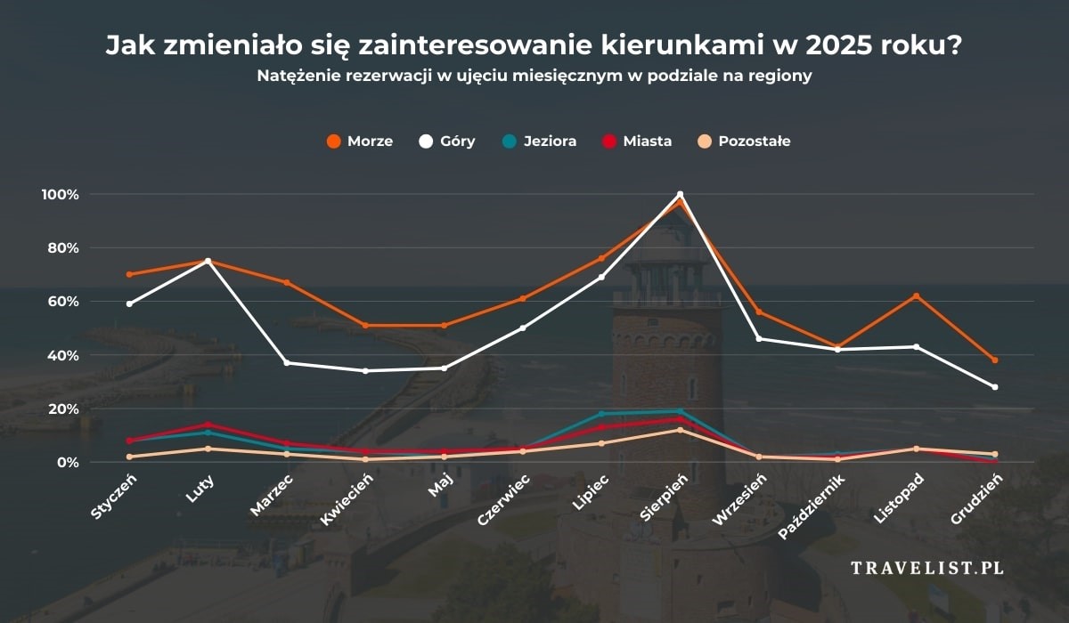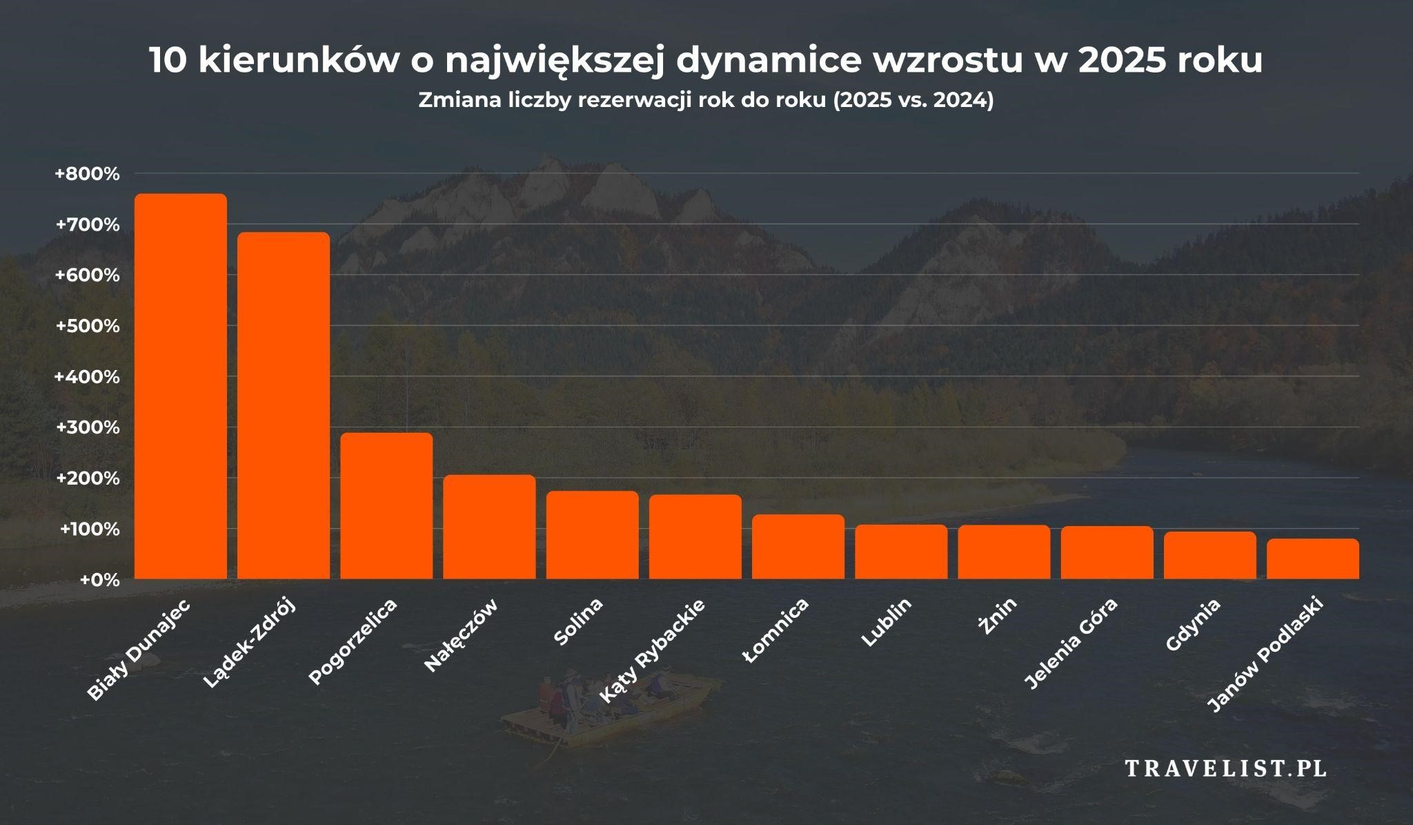 W 2025 roku nad Bałtykiem dominowały Kołobrzeg, Gdańsk, Mielno, Międzyzdroje i Świnoujście. Jednocześnie na wybrzeżu największe wzrosty zainteresowania odnotowały Pogorzelica (+289 proc.), Kąty Rybackie (+167 proc.) i Gdynia (+94 proc.). W górach czołówkę najpopularniejszych kierunków tworzyły Szklarska Poręba, Świeradów-Zdrój, Szczyrk, Wisła i Zakopane, a w kontekście dynamiki wzrostu wyróżniały się Biały Dunajec (+760 proc.), Lądek-Zdrój (+684 proc.) i Solina w Bieszczadach (+174 proc.). Z kolei nad jeziorami najwięcej rezerwacji przypadło na Ostródę, Koprzywnicę, Żnin, Olsztyn i Iławę, przy czym najszybciej rosły Żnin (+107 proc.), Kromerowo (+72 proc.) i Olsztyn (+19 proc.). W miastach najchętniej wyjeżdżaliśmy do Krakowa, Warszawy, Wrocławia, Torunia i Poznania. Jednak w tej kategorii to Lublin mógł pochwalić się największymi wzrostami rok do roku (+108 proc.), a także Wrocław i Warszawa, które mimo dojrzałej pozycji rynkowej zyskały 6 i 5 proc.