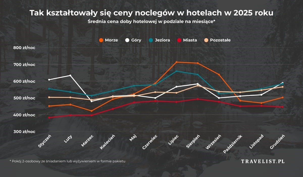Eksperci Travelist.pl sprawdzili też, jak sezonowość oddziałuje na ceny w zależności od regionu. Tu zaskoczeń jest niewiele, gdyż przykładowo w górach najwyższe stawki notowano w trakcie ferii: w styczniu i lutym przekraczały one 600 zł za noc, podczas gdy latem i wczesną jesienią ceny spadały tam nawet poniżej 500 zł. Odwrotnie było nad morzem, gdzie szczyt cen naturalnie przypadał na lipiec i sierpień (powyżej 700 zł), a już w październiku i listopadzie noclegi wyraźnie taniały i kosztowały mniej niż 500 zł. Najbardziej przystępną cenowo kategorią przez cały rok pozostawały natomiast wyjazdy do miast – średnio 449 zł za noc – przy czym nawet w szczycie sezonu wakacyjnego ceny city breaków rzadko przekraczały 500 zł. Sprawia to, że mimo spadku zainteresowania tym segmentem, miasta nadal pełnią rolę „bezpiecznej” cenowo alternatywy wobec wypoczynku w najpopularniejszych kurortach.