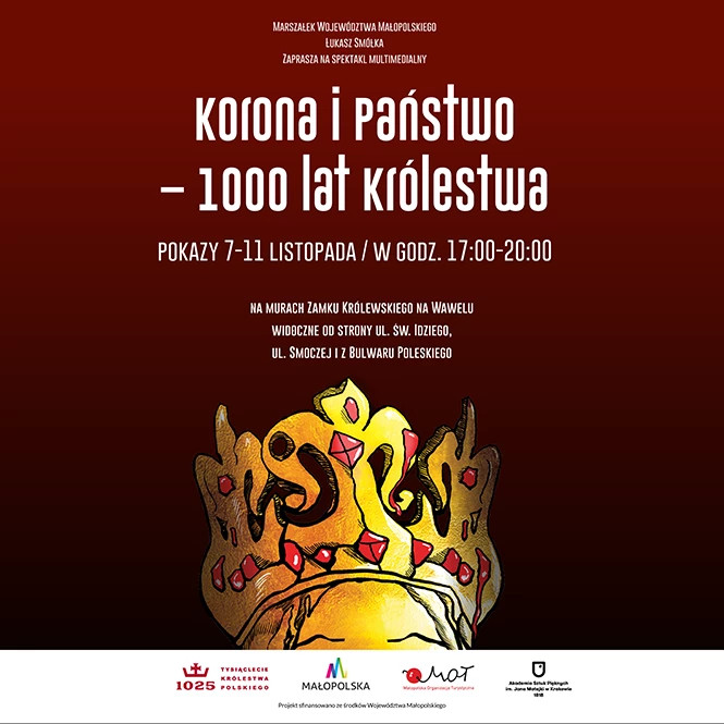 Na spektakl multimedialny zaprasza Łukasz Smółka – Marszałek Województwa Małopolskiego. Widowisko „Korona i Państwo – 1000 lat Królestwa” zostało zrealizowane przez Akademię Sztuk Pięknych im. Jana Matejki w Krakowie. Partnerem wydarzenia jest Małopolska Organizacja Turystyczna. Projekt sfinansowano ze środków Województwa Małopolskiego.
