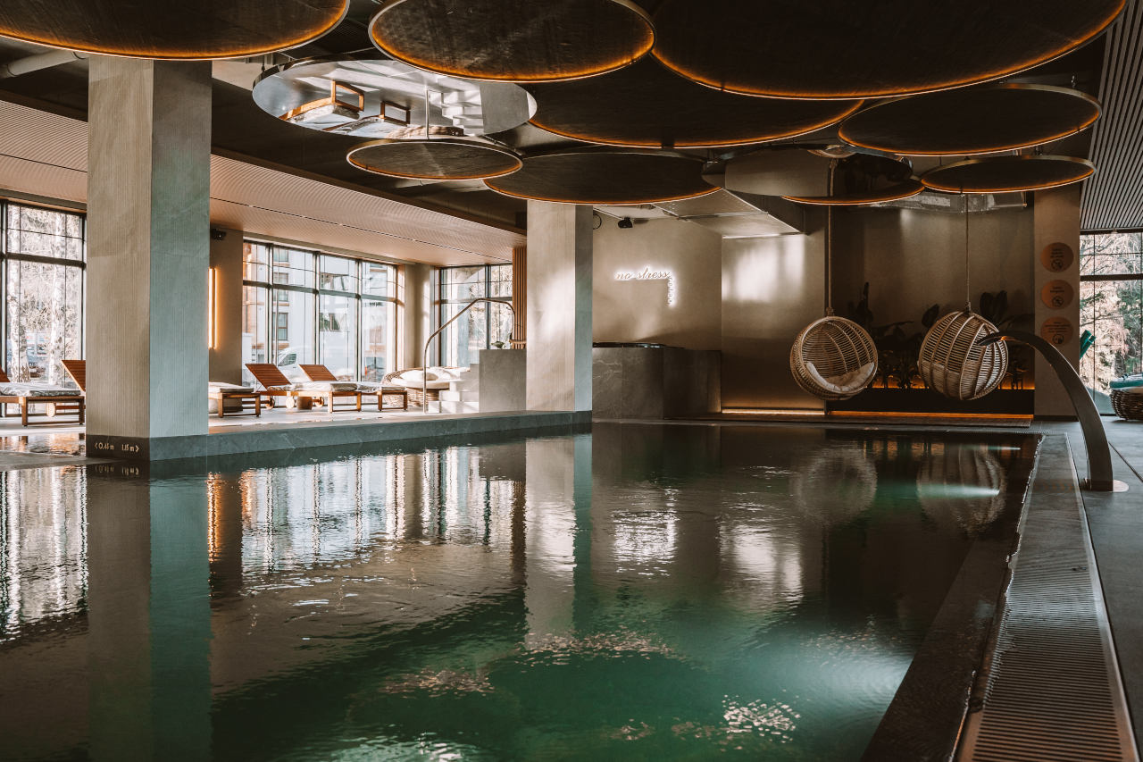 Wnętrza zaprojektowane przez wrocławską pracownię MIXD łączą nowoczesne aranżacje z naturą i akcentami regionalnymi. Przydymione kolory, marmur i drewno wprowadzają atmosferę subtelnej elegancji, a kontrastujące wykończenia nadają przestrzeni dynamizmu.