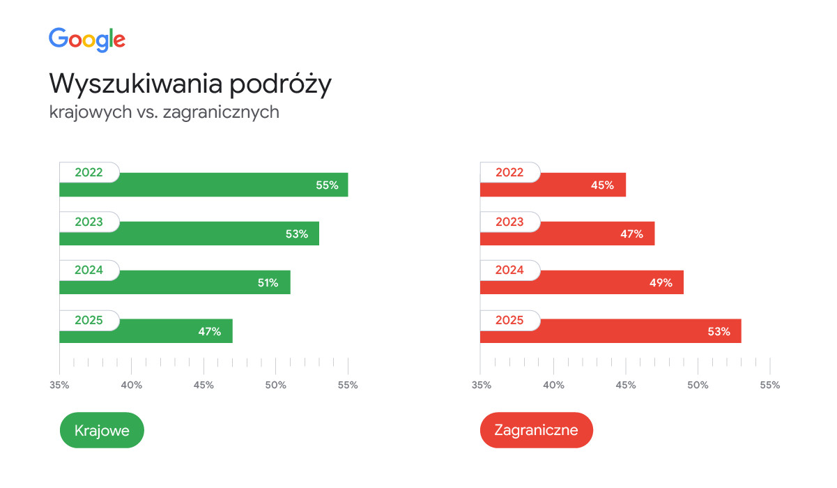 W tym roku widzimy wyraźną zmianę w zachowaniach użytkowników i użytkowniczek – po raz pierwszy w wyszukiwaniach Google było więcej zapytań o zagraniczne wyjazdy niż o podróże krajowe. To znaczący zwrot, biorąc pod uwagę, że jeszcze w 2024 roku przewaga dla wypoczynku w Polsce nad zagranicą wynosiła 4%. W poprzednich latach ta tendencja się utrzymywała – w 2023 roku 53% zapytań dotyczyło wyjazdów w Polsce, a 47% poza jej granicami, a w 2022 roku odsetek ten wynosił aż 55% vs. 45%. W latach pandemii (2020–2021), gdy ruch turystyczny był ograniczony, ponad 60% wyszukiwań dotyczyło lokalnych kierunków. Jeśli chodzi o liczbę i intensywność zapytań na temat podróży, dziś nieznacznie wzrosła w porównaniu do zeszłego, o 3%. Choć zmienia się rozkład preferencji, ulubione destynacje Polaków pozostają właściwie niezmienne
