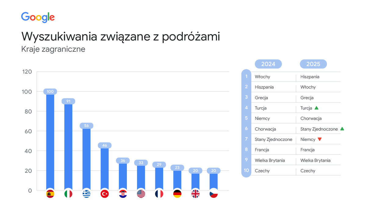 Rozpoczął się sezon wakacyjny, a dane z wyszukiwarki Google pokazują wyraźny zwrot w turystycznych preferencjach Polek i Polaków. Po raz pierwszy zagraniczne kierunki prześcignęły rodzime destynacje. W wyszukiwaniach dominują Hiszpania, Włochy i Grecja, przy czym Hiszpania wyprzedziła dotychczasowego lidera – Włochy. Ogromny skok dotyczy wyszukiwań wyjazdów all inclusive, które w tym roku wzrosły o ponad 1/3. Zwrot ku zagranicznym podróżom.