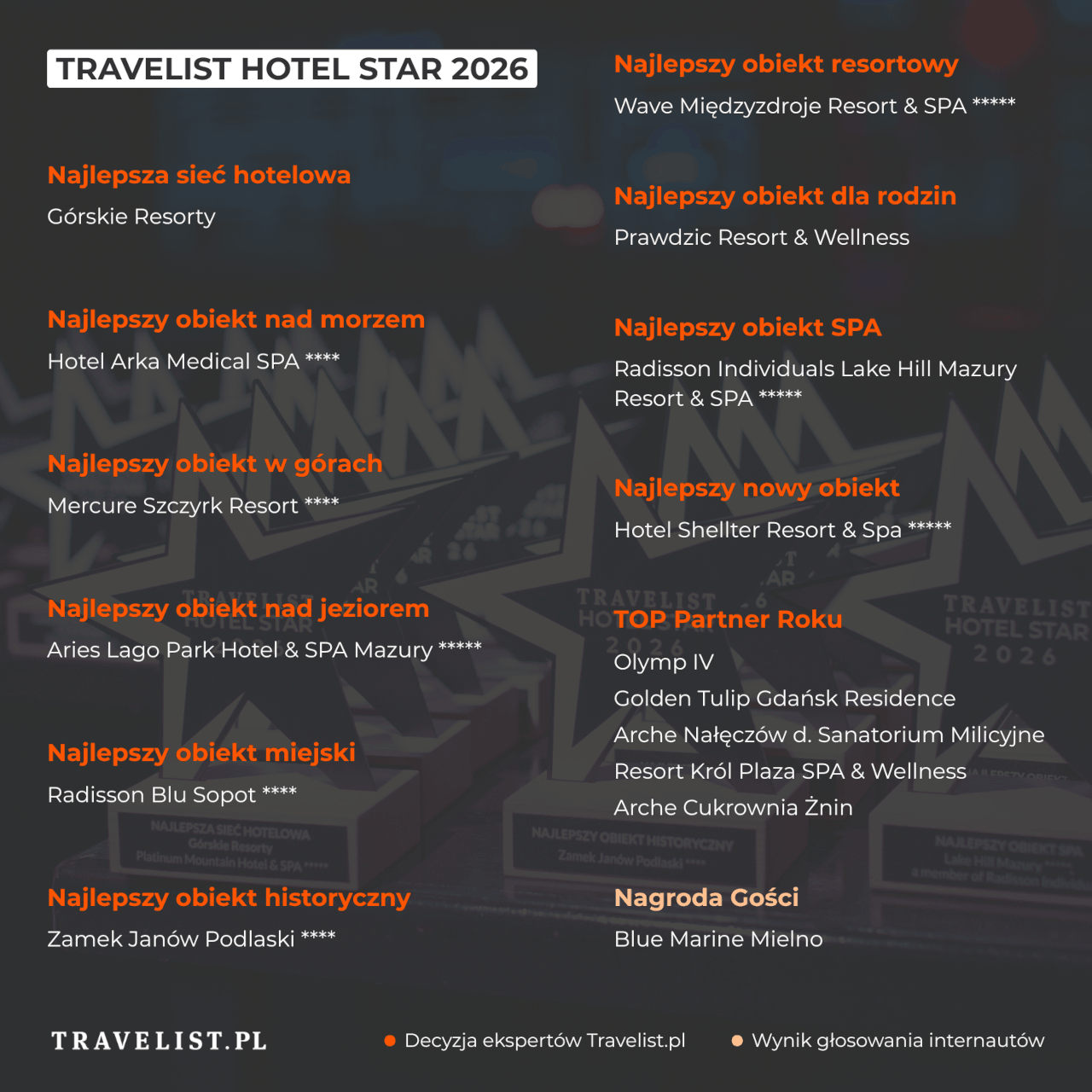 W 11 kategoriach zwycięzców Travelist Hotel Star 2026 wyłoniła kapituła złożona z ekspertów Travelist.pl. Oto ich laureaci: