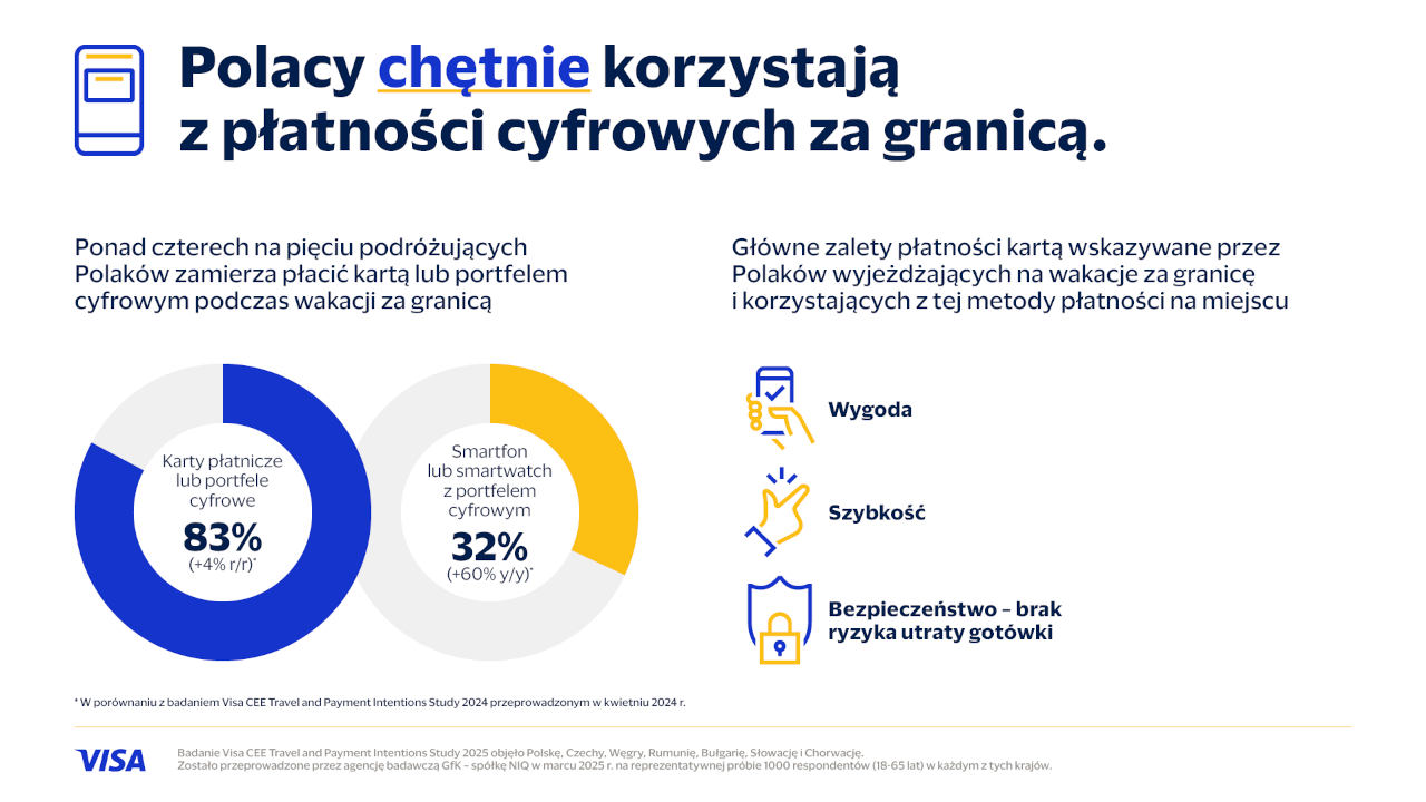 Badanie Visa pokazuje, że płatności cyfrowe stają się dla Polaków codziennością zarówno w kraju, jak i podczas zagranicznych podróży. Ponad 4 na 5 polskich turystów deklaruje, że będąc na wakacjach w innym kraju będzie płacić kartą, smartfonem lub smartwatchem (wzrost o 4% rok do roku). Szczególnie dynamicznie rośnie popularność portfeli mobilnych – aż o 60 proc. w ujęciu rocznym. Dla jednej trzeciej Polaków to dziś preferowana metoda płatności podczas zagranicznych wyjazdów. Korzystanie z kart Visa umożliwia szybkie i bezpieczne płatności w ponad 150 milionach punktów handlowych na terenie 200+ państw i terytoriów zależnych, w przeszło 180 walutach. Znaczenie tych aspektów podkreślają również podróżni z regionu CEE – najczęściej wskazując na wygodę (64%), szybkość (61%) i bezpieczeństwo (55%) jako główne zalety płacenia kartą za granicą.
