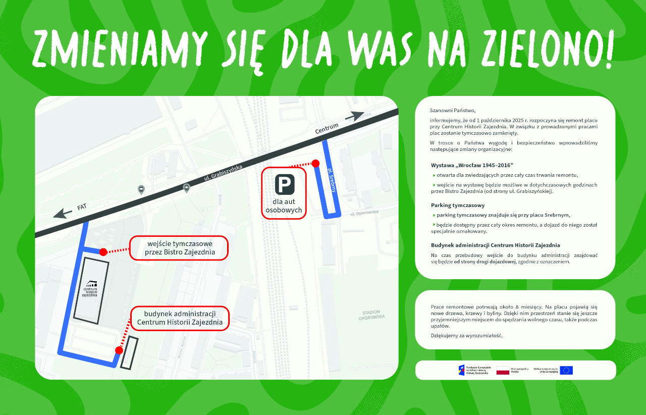 Za kilka miesięcy plac nie będzie już taką wyspą ciepła, jak obecnie. Aby jednak uzyskać ten efekt, przez pewien czas będzie utrudniony dostęp do parkingu, a przejście przez plac będzie niemożliwe. Dla odwiedzających Centrum Historii Zajezdnia został przygotowany tymczasowy parking przy ul. Oporowskiej, a specjalne oznakowanie umożliwi swobodne i bezpieczne dojście od ul. Grabiszyńskiej do hali wystawowej Centrum Historii Zajezdnia. Wystawa główna „Wrocław 1945–2016” przez cały czas trwania prac będzie czynna!